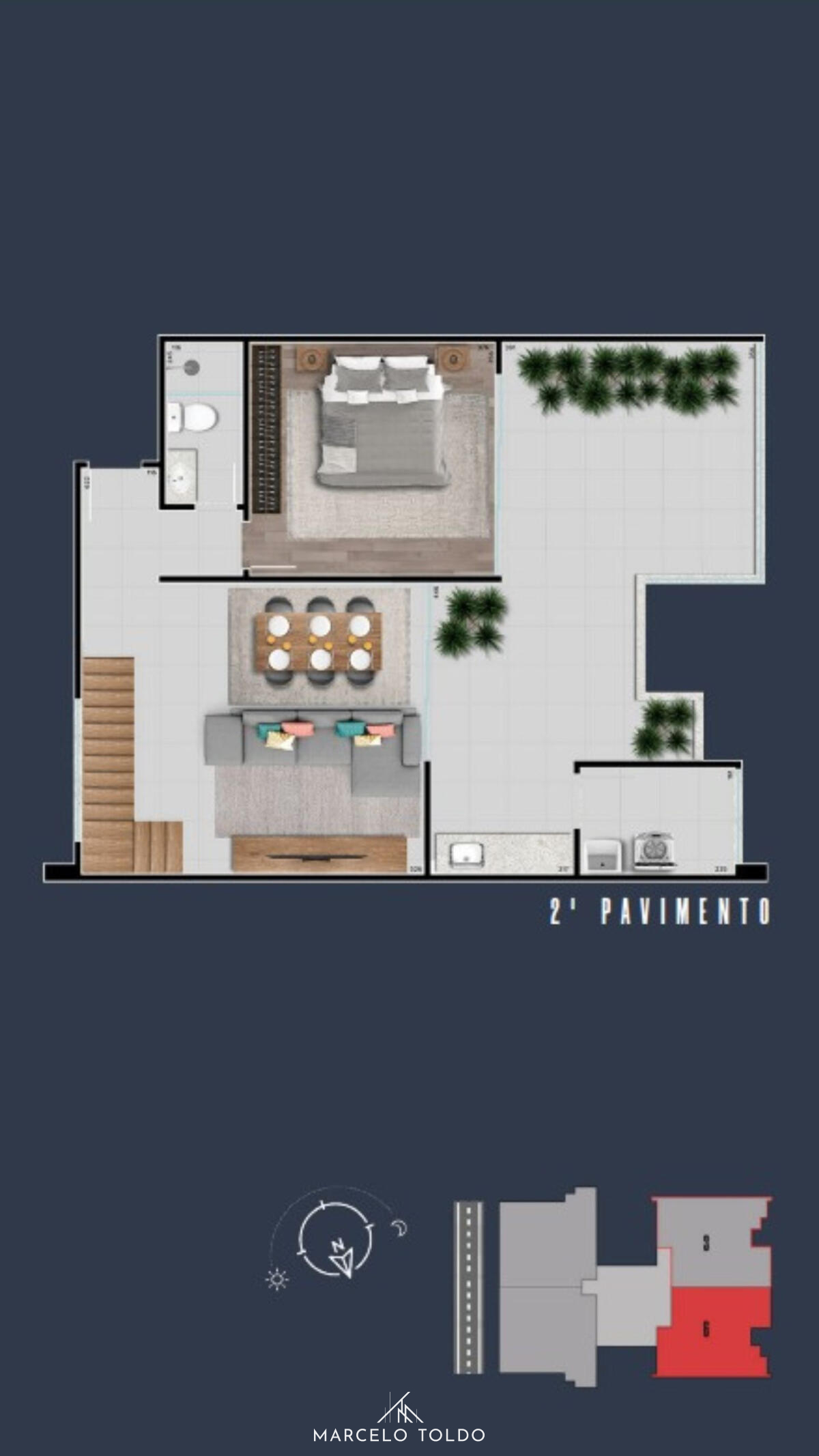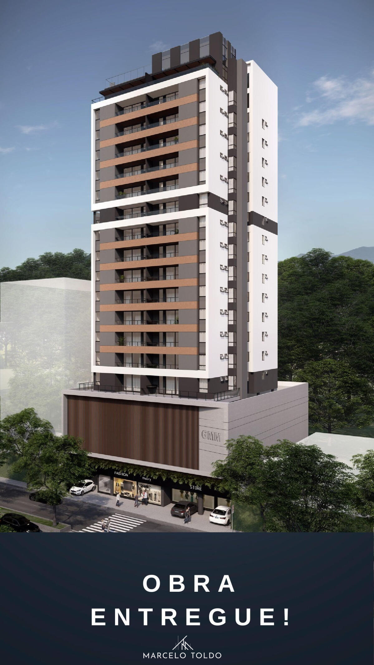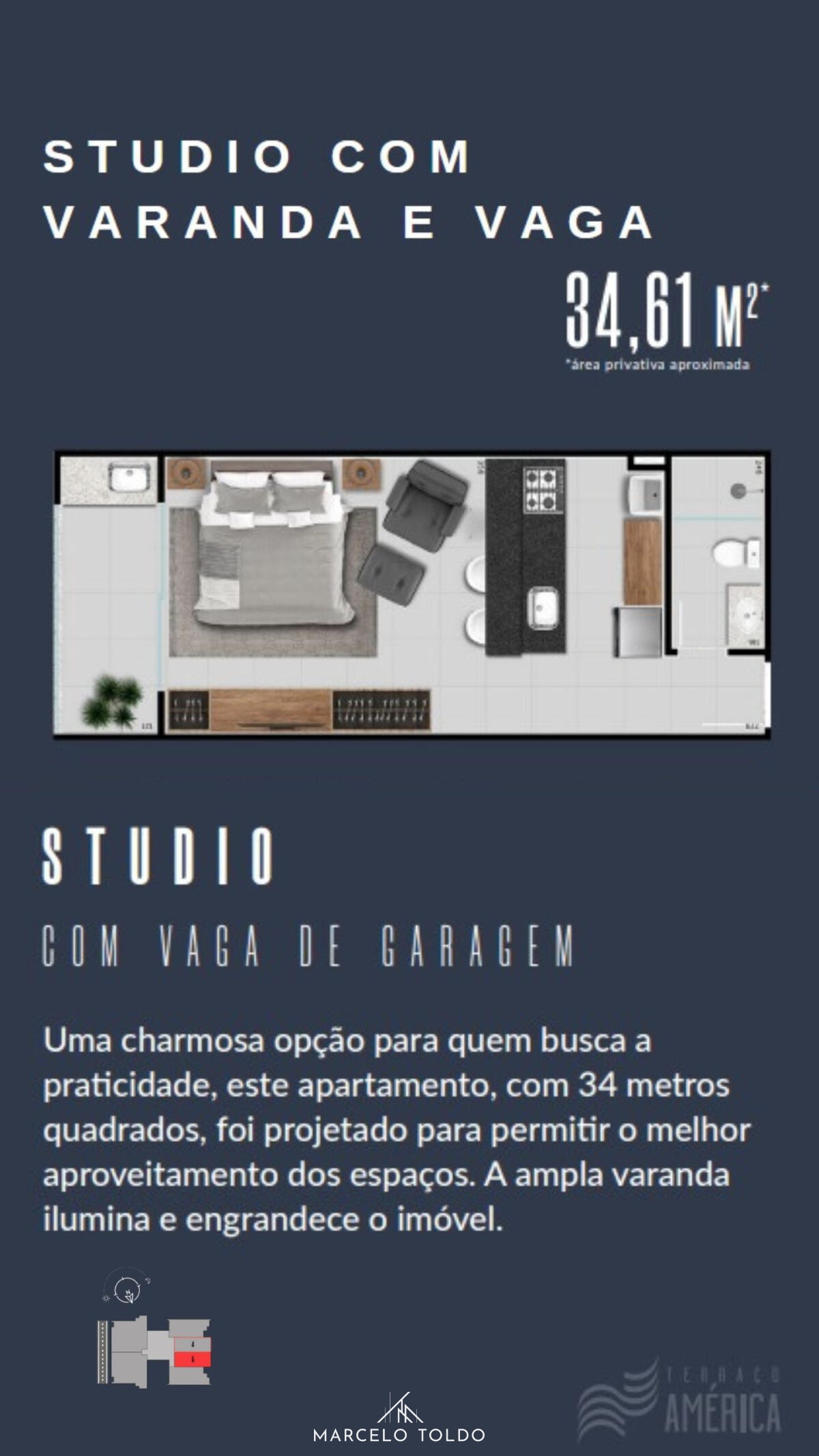Studios modernos de 34m², com varanda e laje técnica para ar-condicionado – mais conforto e espaço interno livre. Projeto da GMM com design inteligente e excelente aproveitamento dos ambientes.